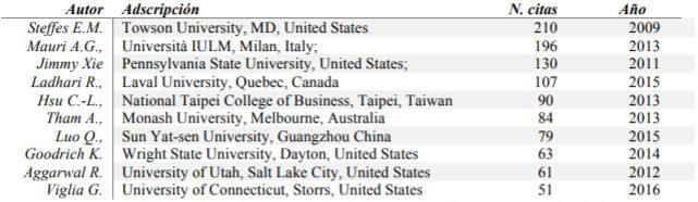 El autor más citado es Steffes (n=210) con sólo un documento (Steffes & Burgee, 2009); así como Mauri (Mauri & Minazzi, 2013), (n=196); Xie (Xie et al., 2011), (n=130). Ladhari (Ladhari & Michaud, 2015), (n=107). Los cuatro autores con sólo un artículo. La Tabla 3 muestra los resultados de estos autores, así como su adscripción.