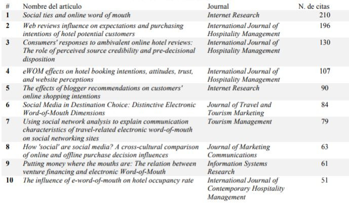 En la Tabla 4, se muestra el título de los artículos más citados. El más ranqueado es Social ties and online word of mouth (Steffes & Burgee, 2009), con 210 citas (n=210) publicado en la revista Internet Research; seguida por “Web reviews influence on expectatios and purchasing intentions of hotel potential customers” (Mauri & Minazzi, 2013) con 196 (n=196) publicado en International Journal of Hospitality Management; y en tercer lugar “Consumers' responses to ambivalent online hotel reviews: The role of perceived source credibility and pre-decisional disposition” (Xie et al., 2011), con 130 citas (n=130) de la misma revista anterior.