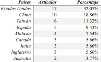 En la Tabla 5 se observa la cantidad de artículos escritos por país y su porcentaje. El más prolífero es Estados Unidos con el 32.07% (n=17/53). En segundo está China con 18.86% (n=10/53); seguido de Taiwán con el 11.32% (n=6/53); España, 9.43% (n=5/53); Malasia, 7.54% (n=4/53). Después siguen Canadá, Italia e Inglaterra con el 5.66% (n=3/53). Finalmente, está Australia con el 3.77% (n=2/53). El restante listado de países que no aparecen de los 23, tienen entre 2 y 1 artículo solamente.