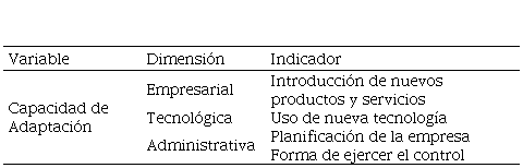 La presente investigación forma parte de un estudio más amplio que mide el grado de correlación entre las capacidades dinámicas como factor de competitividad de las microempresas de abarrotes de la Región Cuitzeo del Estado de Michoacán, México. El enfoque de la investigación es mixto, describiendo el objeto de estudio y determinando la correlación que existe entre la capacidad de adaptación y la competitividad de las microempresas del ramo de abarrotes en la Región Cuitzeo. En este sentido, la variable independiente es la capacidad de adaptación y la variable dependiente es la competitividad. Para medir la capacidad de adaptación se consideran cuatro indicadores en tres dimensiones diferentes, tal como se muestra en la tabla 2.