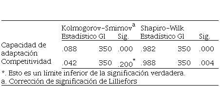Con el objeto de corroborar si los datos recabados muestran una distribución normal, se aplicó el test de Kolmogorov-Smirnov (tabla 3). El programa SPSS lo calcula con la corrección de significación de Lilliefors. Esta prueba se considera como la más adecuada en tamaños de muestra mediana. Cuando la significancia resultante es menor a 0.05 se considera que la distribución no es normal. Los resultados de la prueba marcan que los datos arrojados por la investigación en cuanto a la Capacidad de Adaptación tienen una significancia de 0.000, por lo que no cubre el supuesto de normalidad.