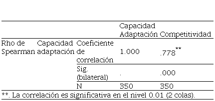 Utilizando el coeficiente de correlación de Spearman entre la variable independiente capacidad de innovación y la variable dependiente competitividad, el coeficiente de correlación resultante fue de 0.778, con una correlación significativa en el nivel 0.01 (tabla 4). Ello muestra que existe una asociación positiva fuerte entre las variables, por lo que se demuestra que la Capacidad de Adaptación es factor de la Competitividad en el sujeto de estudio.