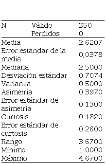 Como la escala de Likert es aditiva, las puntuaciones se obtienen sumando los valores entendidos en cada pregunta en el cuestionario, recordando que el número de categorías de respuesta es el mismo para todas las preguntas. En una escala de Likert, el puntaje máximo es igual al número de ítems multiplicados por el puntaje mayor en cada alternativa de respuesta, mientras que el puntaje mínimo es el resultado del número de ítems multiplicado por el puntaje menor de las alternativas de respuesta (Pedraza et al., 2004). Se utilizó el Programa IBM SPSS Statistics 21 para el procesamiento de los datos.