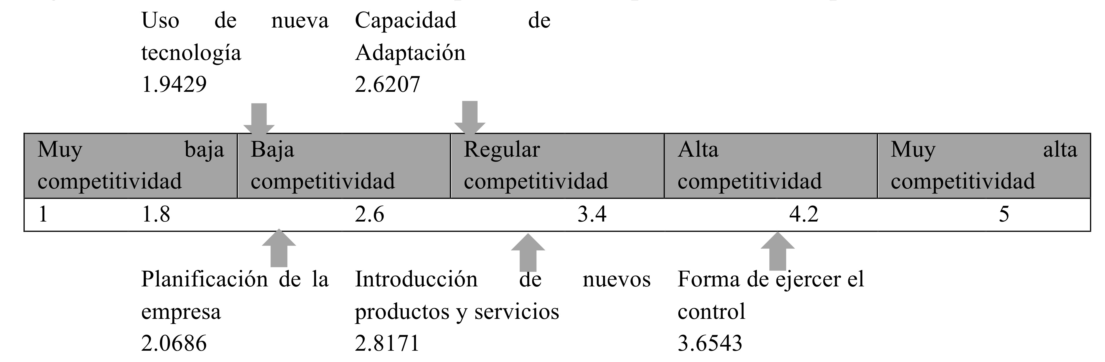 El uso de nuevas tecnologías es el indicador con menor calificación, con solamente un 1.9429, estableciéndose en el rango Baja competitividad por solamente 0.1429. El actualizarse en el uso de tecnologías acorde al segmento empresarial es causa de baja competitividad, tanto por la renuencia a aceptar sus ventajas en la operación, como por la baja accesibilidad a dichas tecnologías, por su costo; así como por la baja penetración que tiene el sector en el mercado bancario para financiar su compra (Texis et al., 2011).