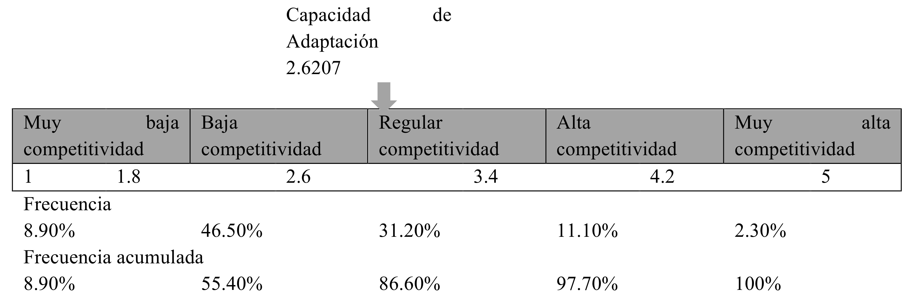 La estadística descriptiva de la variable Capacidad de Adaptación arroja una media con un valor de 2.6207 (tabla 5). La desviación estándar es de 0.7074. La asimetría es positiva en la capacidad de adaptación con 0.397, señalando que los valores observados tienden a agruparse a la izquierda de la curva, tal como se muestra en la frecuencia acumulada donde el 55.4% de los datos aparecen en los rangos de Muy baja y Baja competitividad de la escala.