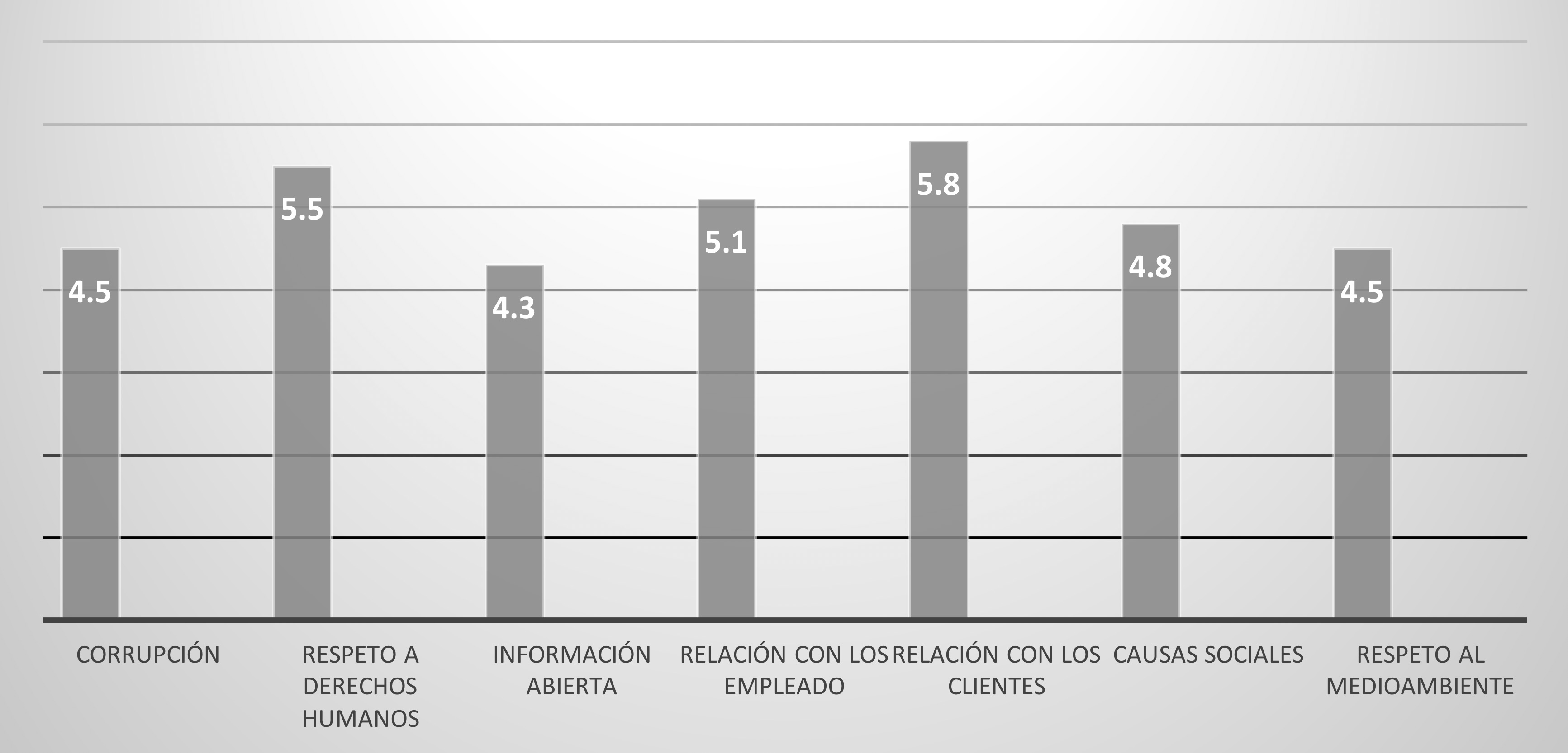 Con respecto a lo anterior, en la gráfica 1 se muestra un análisis a partir de la recopilación de opiniones de los consumidores con relación a las prácticas de RSE. En esta gráfica se ve el grado de importancia que los individuos otorgan a cada uno de los aspectos en torno a la responsabilidad social. Como es de esperarse, los consumidores opinan que lo más importante para ellos es la relación de la empresa con los clientes, seguido por el respeto a los derechos humanos, tendencias en alza en la RSE.