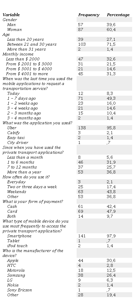 The present investigation used the quantitative approach. The main method of data collection was surveyed. The items of the questionnaire were adapted and modified from scales previously developed and validated with the appropriate coding for the conditions of young Mexican users. Each item was measured on a 5-point Likert scale with responses ranging from "totally agree" to "totally disagree". The unit of analysis was the undergraduate student, user of private transport applications of the University Center for Economic-Administrative Sciences (CUCEA) of the University of Guadalajara. Previous experience was necessary to be able to evaluate satisfaction and intention to continue using this type of app. The sampling technique was random, with a size of 202 participants from the various educational programs. Of this number of applied surveys, once the data had been tabulated and reviewed, 144 good surveys remained (corresponding to 71.28%), eliminating the missing or null data. Partial least squares structural equation modeling (PLS-SEM) was used to test the model. The software employing was the SmartPLS 3.