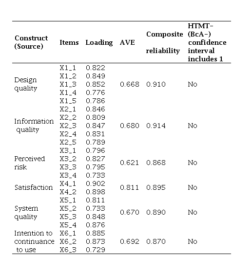 Table 2 presents the results of the reliability and validity test. All measures meet the quality criteria: factor loadings are greater than 0.7, average variance extracted is greater than 0.5, and composite reliability is greater than 0.7. Furthermore, all constructs showed sufficient levels of discriminant validity according to the heterotrait-monotrait (HTMT) criterion (Hair et al., 2017).