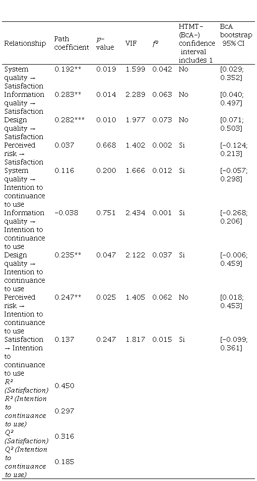 The results of R2 for satisfaction are explained 45% by quality of the system, quality of the information, quality of the design and perceived risk. According to the thresholds established in the literature, it can be considered moderate values.