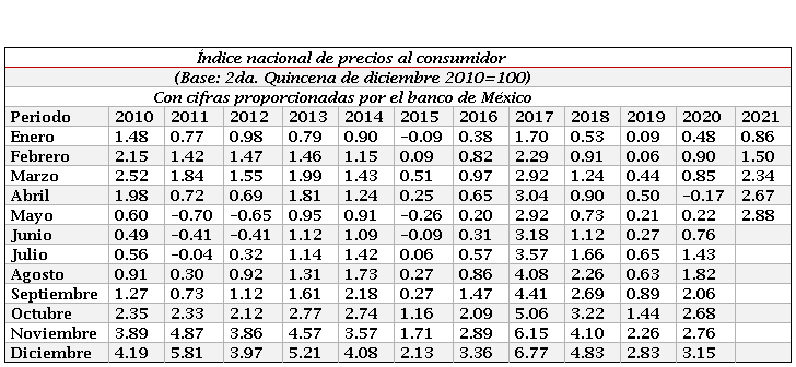Elaboración propia con cifras proporcionadas por el Banco de México e Instituto Nacional de Geografía y Estadística. http://www.inegi.org.mx/sistemas/bie/ (consultado en junio 30 de 2021) Ruta temática: Precios e inflación > Índice nacional de precios al consumidor >Mensual > Índice > Índice general y por objeto del gasto > Índice general
