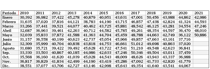 | Enero | 30,392 | 36,982 | 37,422 | 45,278 | 40,879 | 40,951 | 43,631 | 47,001 | 50,456 | 43,988 | 44,862 | 42,986 |