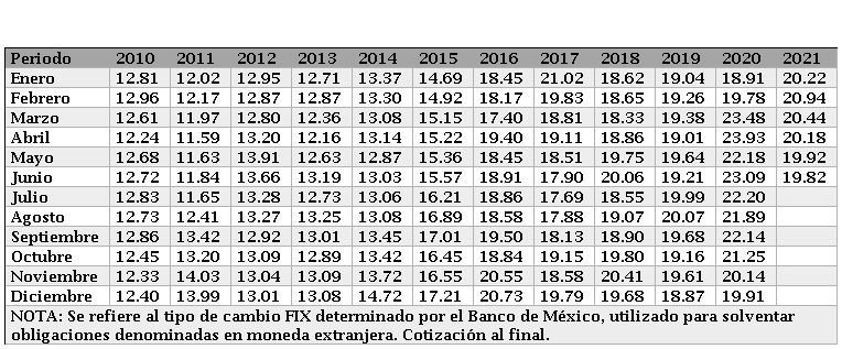 Elaboración propia con cifras proporcionadas por el Banco de México e Instituto Nacional de Geografía y Estadística. http://www.inegi.org.mx/sistemas/bie/ (consultado en junio 30 de 2021) Ruta temática: Financiero y bursátil > Indicadores financieros y bursátiles > Cotización del dólar en el mercado cambiario nacional > Tipo de cambio para solventar obligaciones en moneda extranjera > Cotizaciones al cierre del mes. Venta