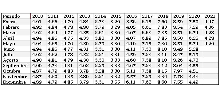 | Enero | 4.91 | 4.86 | 4.79 | 4.84 | 3.78 | 3.29 | 3.56 | 6.15 | 7.66 | 8.59 | 7.50 | 4.47 |