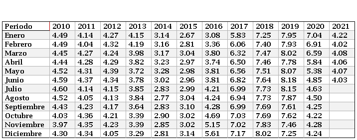 Elaboración propia con cifras proporcionadas por el Banco de México e Instituto Nacional de Geografía y Estadística. http://www.inegi.org.mx/sistemas/bie/ (consultado en junio 30 de 2021) Ruta temática: Indicadores económicos de coyuntura > Indicadores financieros > Tipo de cambio del peso respecto al dólar y valor de las UDIS > Valor de las unidades de inversión (UDIS)