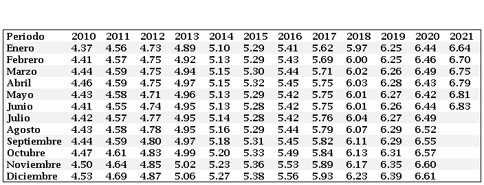 | Octubre | 4.47 | 4.61 | 4.83 | 4.99 | 5.20 | 5.33 | 5.49 | 5.84 | 6.13 | 6.31 | 6.57 | |