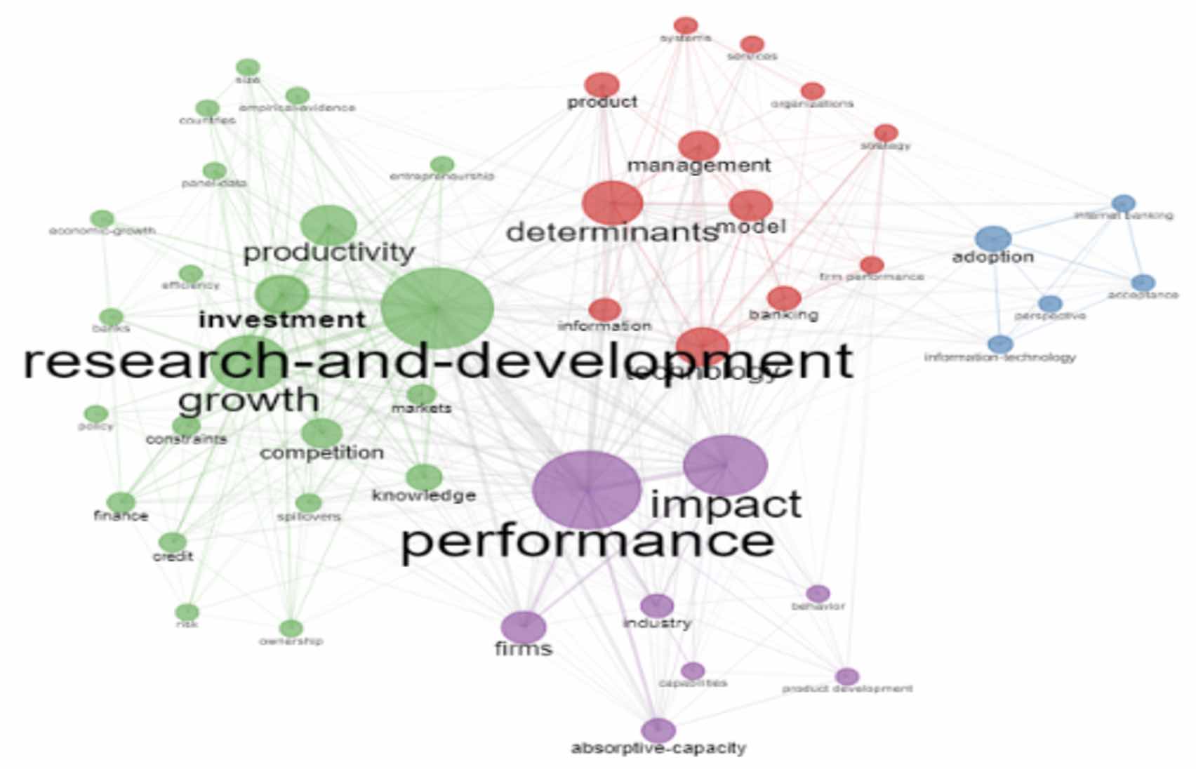 The results obtained group the keywords into 4 clusters. Color helps us identify words that have elements with similar characteristics and thus form a community. The size of the circles and labels are associated with the occurrence of the elements, the larger the size, the greater the importance. To identify the clusters, a label is assigned that is the word with the most occurrences of each group of words, being as follows: Research and Development, Determinants, Adoption, and Performance. They are briefly described to specify the focus of the investigations of each cluster.