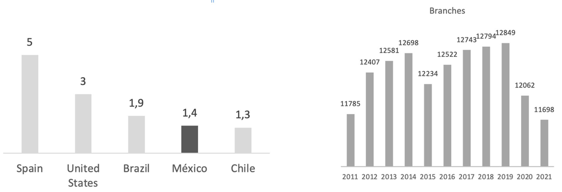 Table 4 shows the growth of banking access points and branches between 2011 and 2021. ATM, Point of Sale Terminals (POS), correspondents, and mobile banking are also part of the dimensions of financial innovation in various articles (Chipeta & Muthinja, 2018; Palaon et al., 2020; Waleed & Tahir, 2020). Mexico presents a significant lag in terms of branches operating in the territory compared to other countries. Spain has 5 branches for every 10,000 adults, the United States 3, and Mexico only 1.4. Despite this lag, it is noteworthy that the number of branches with which it closes the year 2021 is less than 2011 in 87 branches, going from 11,785 branches to 11,698 in 2021. (Graph 7)