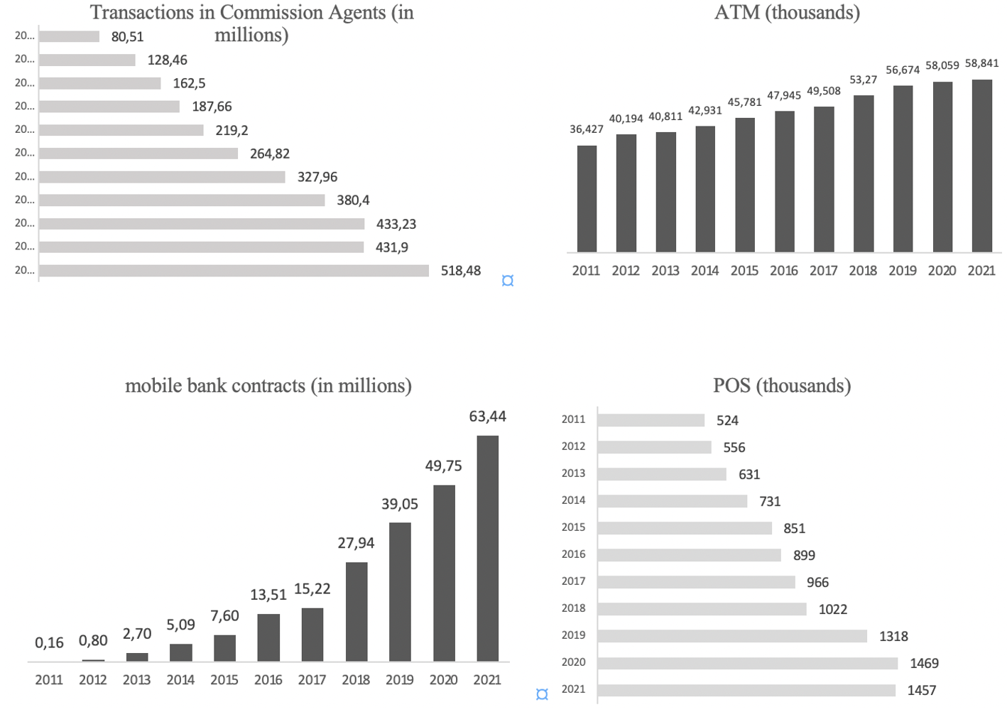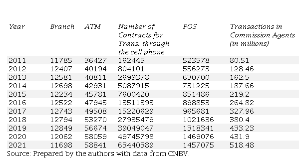 Correspondents, as they are also known, have growing participation in the country's financial system; each year, financial users carry out more banking operations in these establishments: in 2011, 80.51 million were carried out, and by 2021 the total number of transactions was 518.48 million, being its growth of 544% in that period.