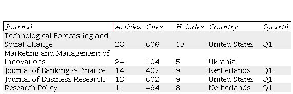 Among the results obtained, high-impact journals publish research on the subject. Of the ten journals that publish the most, seven are from the first quartile, Q1, and the remaining three are from Q2. The American journal Technological Forecasting and Social Change has the most publications and belongs to quartile 1. (Table 1)