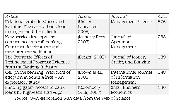 The most influential article by the number of citations is “Relational embeddedness and learning: The case of bank loan managers and their clients”, which has 576 citations and was published in 2003. In second place is the publication “New service development competence in retail banking: Construct development and measurement validation”. This 2007 Journal of Operations Management article has 238 citations. (Table 2)