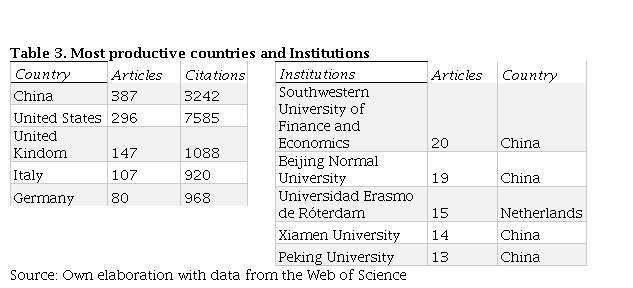 China has the most publications, with 387 articles and 3,243 citations. The United States follows it with 296 publications, the most influential with 7,585 citations. The United Kingdom occupies the third place with 147 publications and 1088 citations. Among the institutions with the most publications are four from China and one from the Netherlands. The Southwestern University of Finance and Economics of China is the most productive institution, which has 20 publications. (Table 3)
