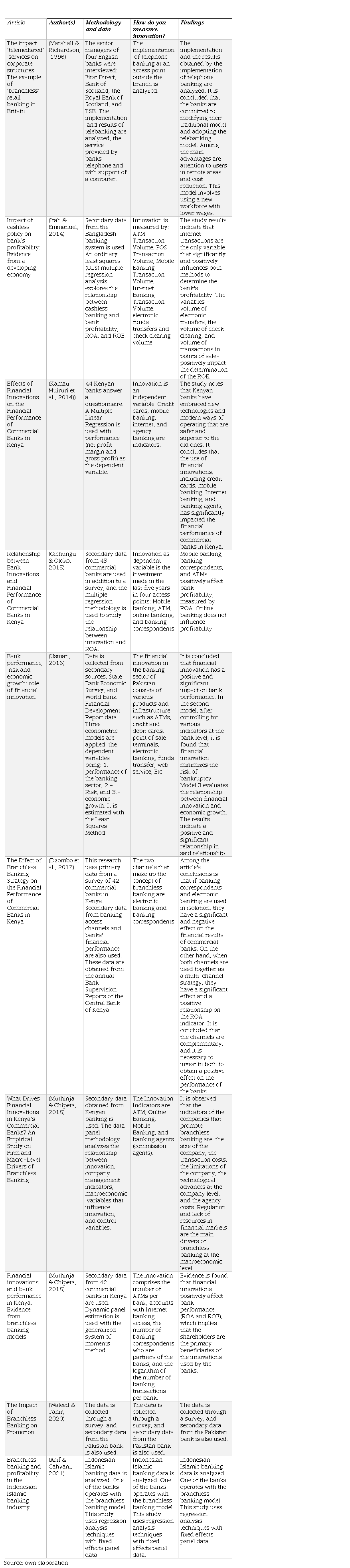So far, the evolution of banks has been described; the essential innovations, their adoption, and the relationship with bank profitability if there is empirical research. The following section refers to studies that measure banking innovation as a variable with multiple dimensions. Empirical research is mentioned that relates banking profitability to the term innovation, emphasizing the term branchless banking.