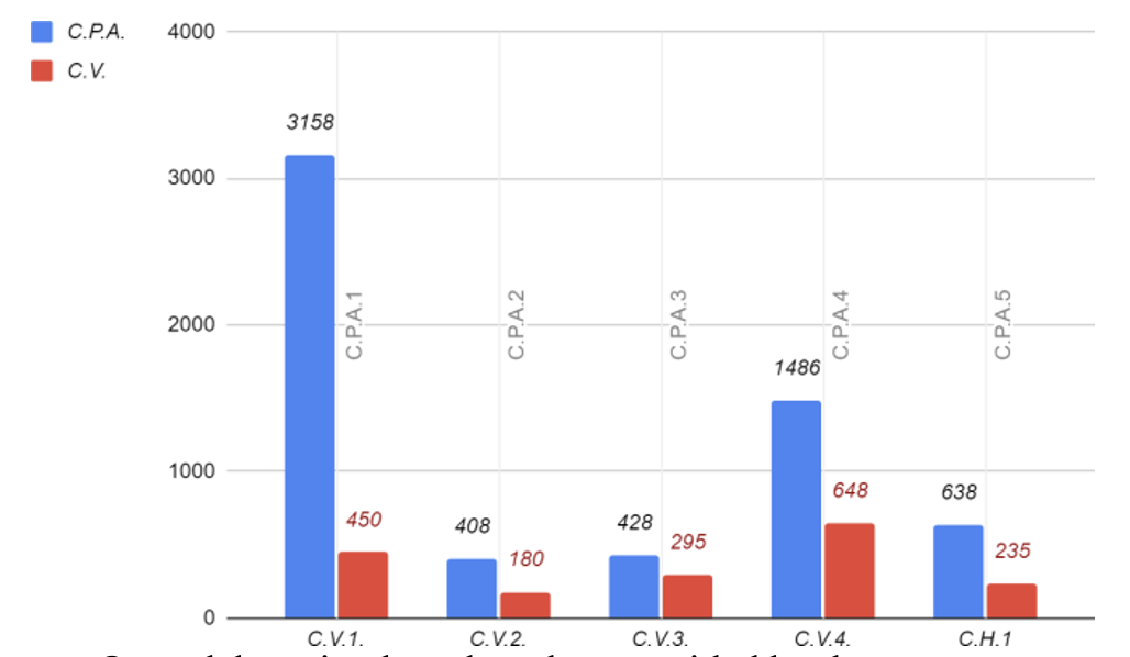 The virtual congress two (C.V.2) leads all types of expenditure that must do exclusively with virtuality, an item that corroborates this is the general design of the entire event, even the virtual rooms, virtual scenarios and animations come out of this item, as well as the expense of the fees of the professionals who provide support in this type of issues. In comparison, the hybrid congress (C.H.1) remains at a standard average, where the agreed requests are given by its facilities, considering that invitations, lunch, and dinner vouchers, etc., are part of this branch of expenses.
