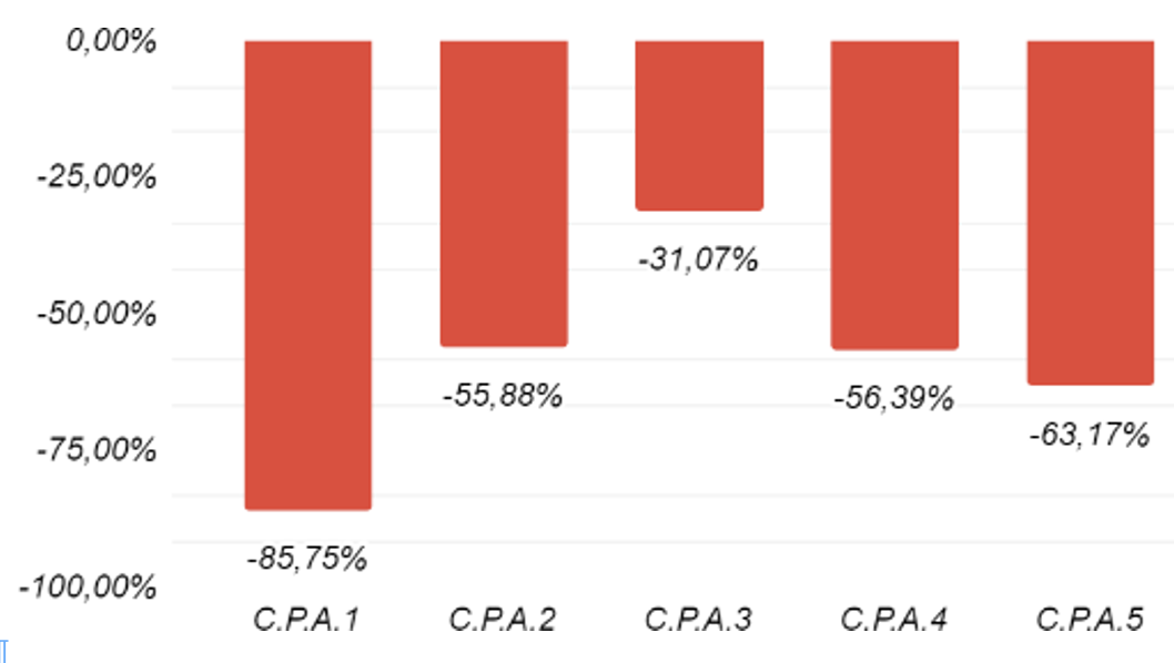 Graph 2 shows the percentage variation between the number of attendees of virtual and hybrid congresses and the data collected from attendees of face-to-face or in-site congresses, ordered from C.P.A.1. to C.P.A.5.