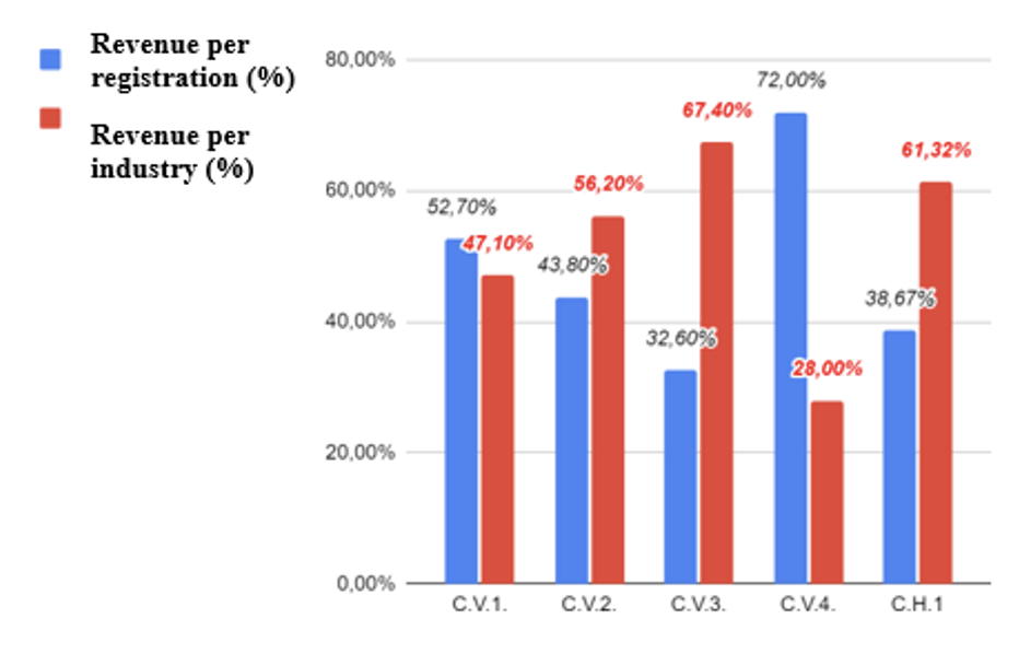 Graph 3 shows the revenue collected in all the virtual congresses studied, quantifying the revenue from registration versus industry (exhibitors and partners). Registration revenue is of great importance in congresses as it accounts for more than 45% of the total revenue of the congress or event. Companies take care of this numbers even before they know how much they are going to spend during the congress organization process.