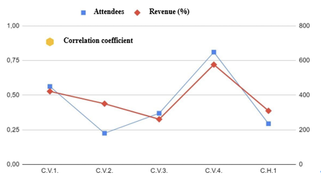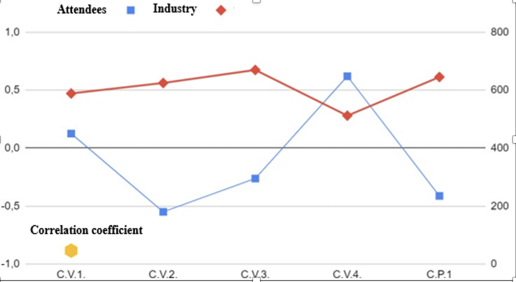 The Pearson’s correlation coefficient in the industry revenue-attendee number is negative (Graph 5), as the value that the organising companies receive in revenue from this item is much lower than the registration revenue analysed above. In short, this section shows the differences in registration according to the virtual or in-site nature of the event. Revenue from events where the industry in the locality of the event does not cooperate is reduced. If the industry has greater accessibility and collaborates, other types of channels are created that can encourage the reach and attendance of both virtual and physical events. Although in the case of industry participation, channels suppose only one factor among others to be taken into account.