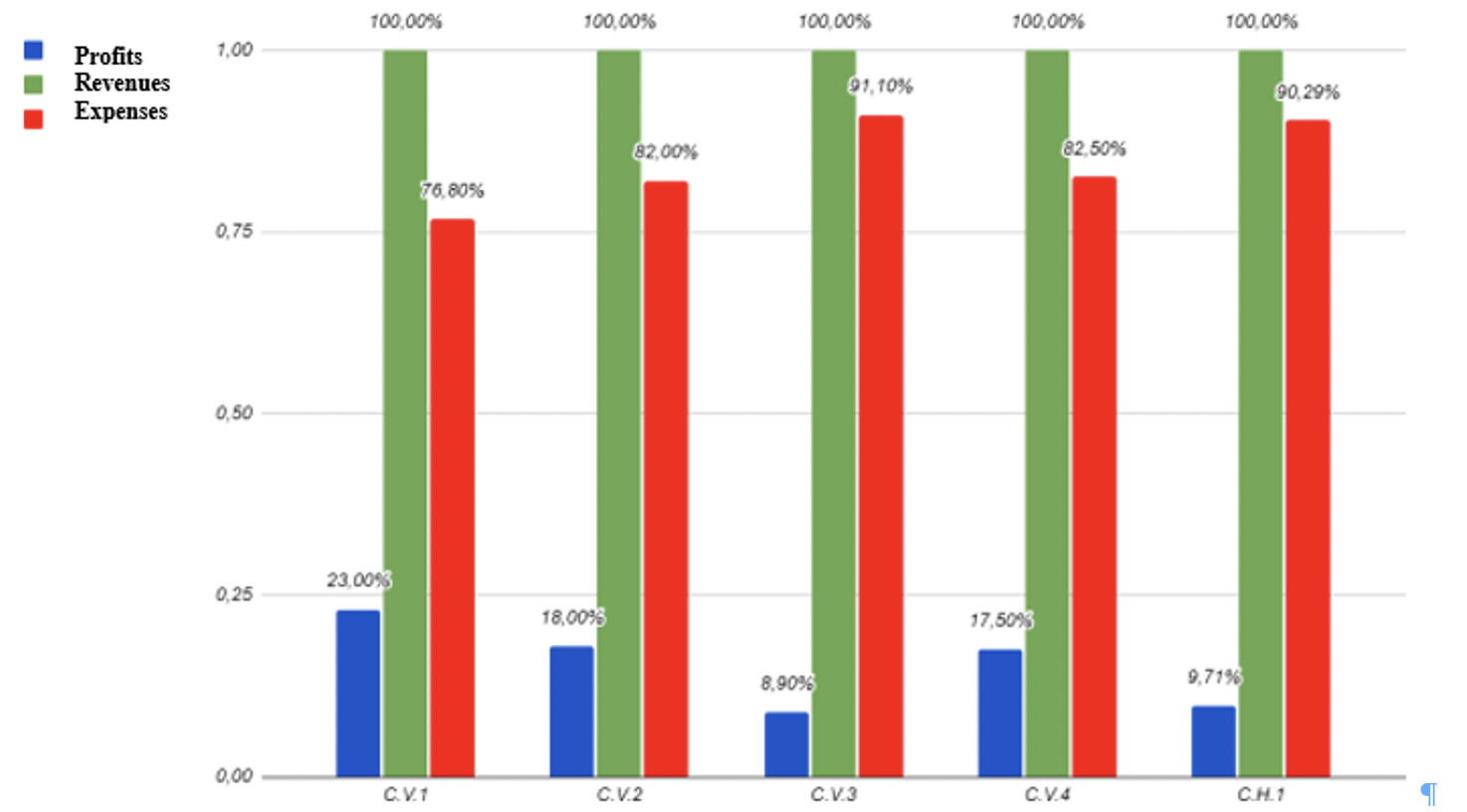 Profits suppose between 9 and 23% of revenues, as the comparison in graph 6 shows. 100% is assigned to revenue, as these are inflows for the company. The profit item shows an average of 15.42% per congress, the virtual congresses one (C.V.1) and two (C.V.2), are the ones that received the most profits for their expenses items with a variable rate of 53.8% and 64% respectively.