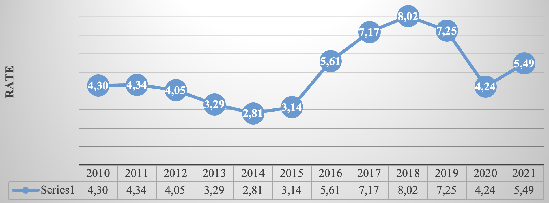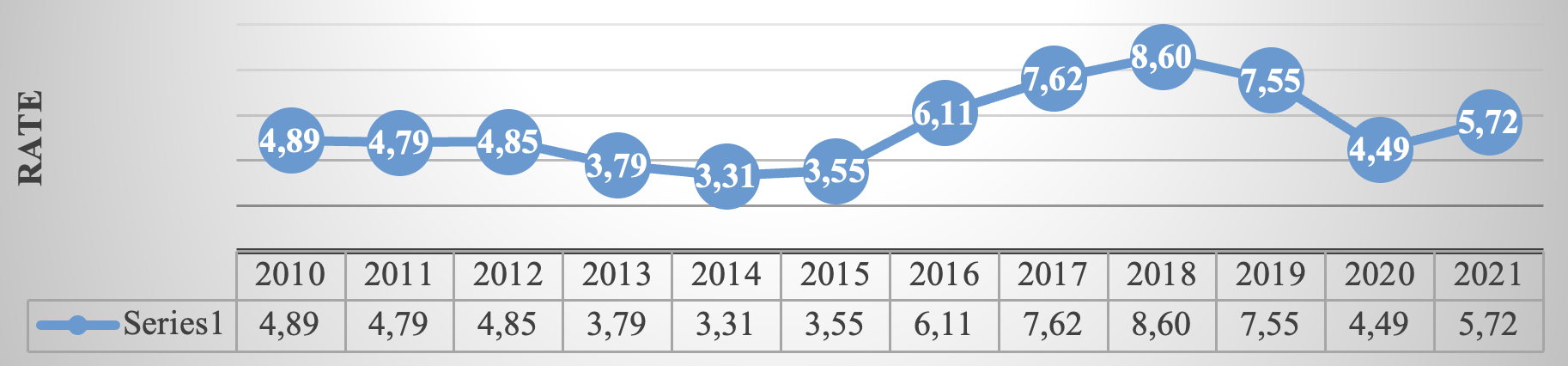 Equilibrium interbank interest rate, 2010- 2021 (at the end of each year)