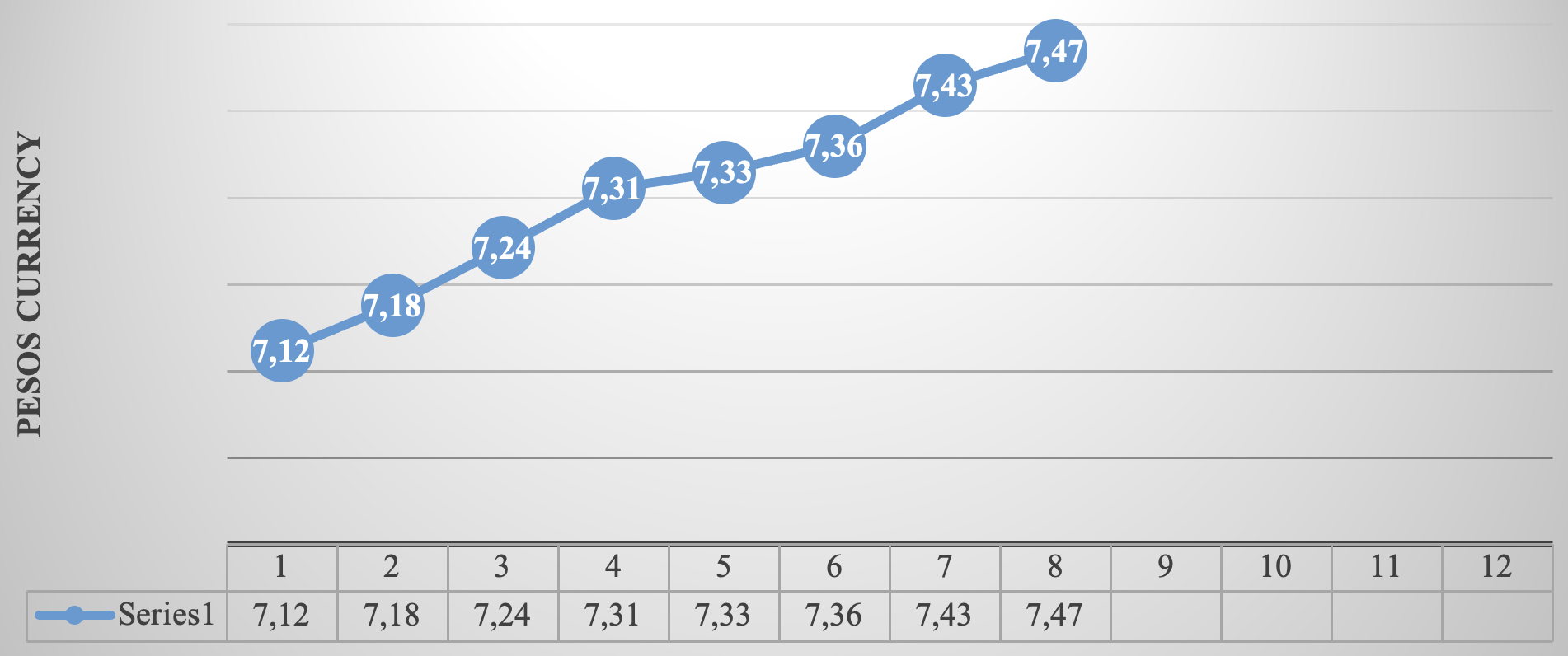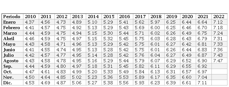 | Enero | 4.37 | 4.56 | 4.73 | 4.89 | 5.10 | 5.29 | 5.41 | 5.62 | 5.97 | 6.25 | 6.44 | 6.64 | 7.12 |