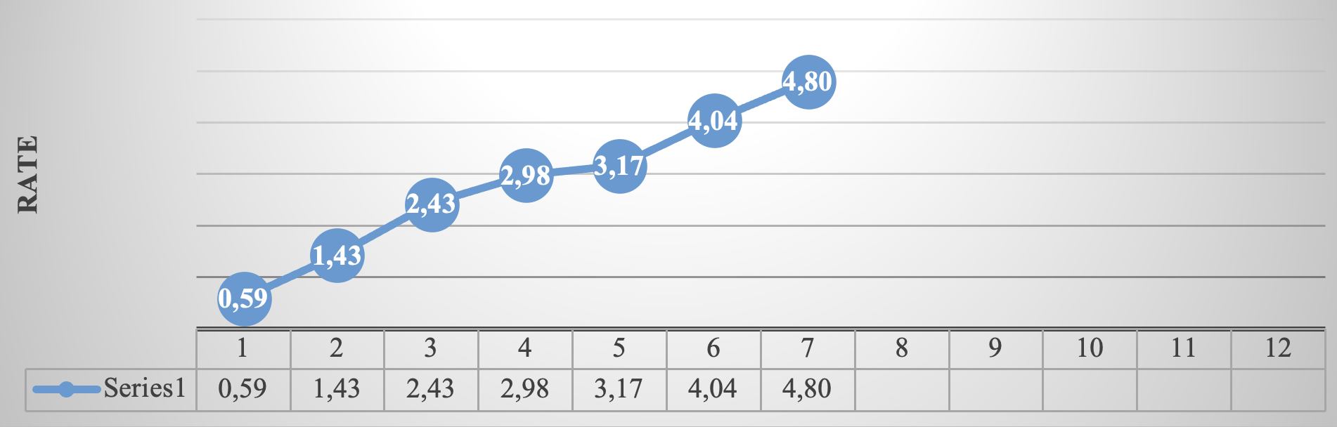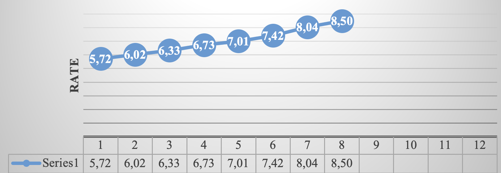 | Marzo | 4.44 | 4.59 | 4.75 | 4.94 | 5.15 | 5.30 | 5.44 | 5.71 | 6.02 | 6.26 | 6.49 | 6.75 | 7.24 |