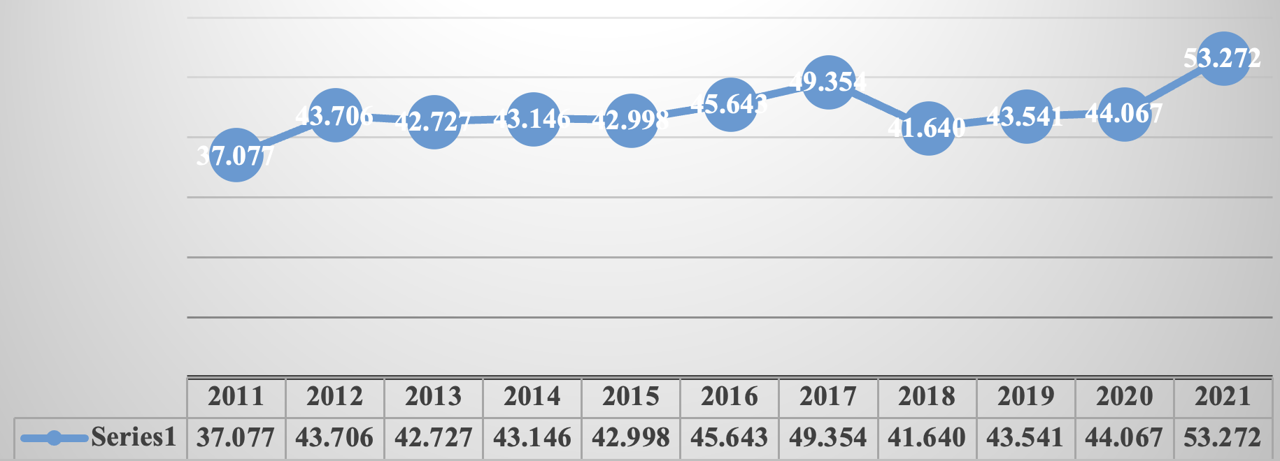 The Price and Quotation Index of the Mexican Stock Exchange, 2010 - 2021 (Score at the end of each year)