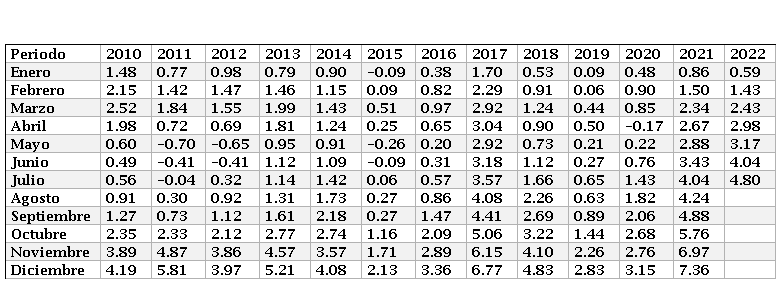 | Julio | 0.56 | -0.04 | 0.32 | 1.14 | 1.42 | 0.06 | 0.57 | 3.57 | 1.66 | 0.65 | 1.43 | 4.04 | 4.80 |