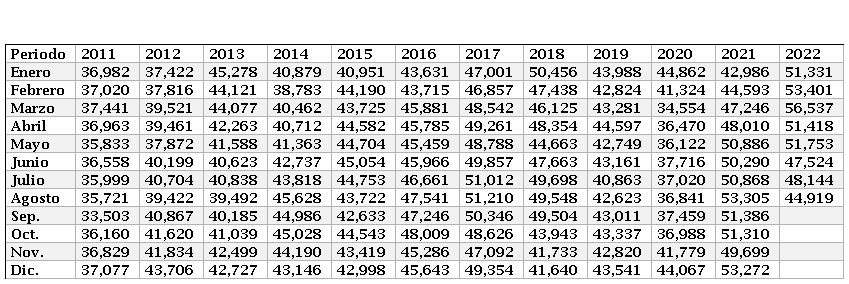 | Agosto | 35,721 | 39,422 | 39,492 | 45,628 | 43,722 | 47,541 | 51,210 | 49,548 | 42,623 | 36,841 | 53,305 | 44,919 |