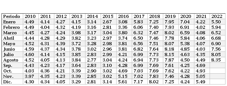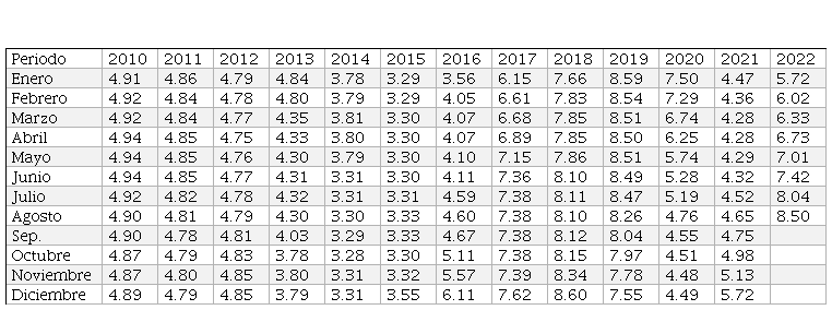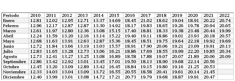 | Septiembre | 12.86 | 13.42 | 12.92 | 13.01 | 13.45 | 17.01 | 19.50 | 18.13 | 18.90 | 19.68 | 22.14 | 20.56 |  |