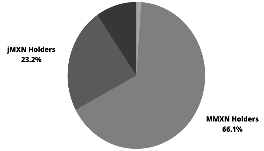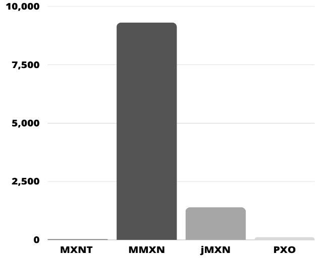 It is observable in Graph 2 that the transactions of stablecoins of the Mexican peso are executed mostly with MMXN stablecoin, and jMXN is the second most used. Despite MXNT and PXO Token's efforts, they do not represent competition for Moneta’s Stablecoin. The data we use to obtain information about the stablecoins’ transactions are from 2021 until November 2022.
