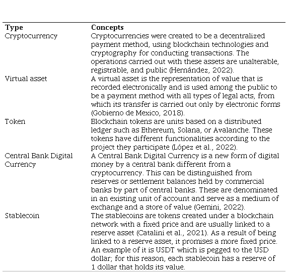 There is a significant difference in the concepts of cryptocurrencies, virtual assets, tokens, central bank digital currencies, and Stablecoins due to the characteristics of each one being different (López et al., 2022). The definitions of these are presented in Table 1.
