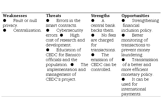 Humphrey (2005) comments that the SWOT matrix is a strategic tool for analyzing a company, institution, or project. It uses internal characteristics such as strengths and weaknesses, and analyzes external situations, including threats and opportunities. Instead, Carnap (2013) mentions that the dynamic methodology is a strategic analysis tool focused on mistakes, problems, successes, and goals. These methods are used to collect criteria for developing a project on Mexican Central Bank Digital Currency.