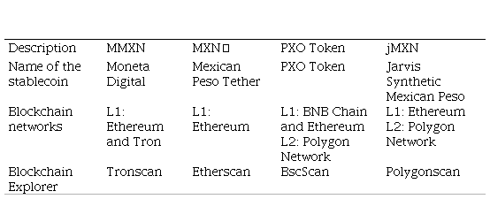The main features of the stablecoins projects of the Mexican peso, according to Tether (2023), PXO Token (2023), Moneta Digital (2023), and Jarvis Network (2023), are shown in Table 3. In this analysis, it is observable that these projects are carried out in several blockchain protocols. They use smart contracts to operate each stablecoin; therefore, the transactions can be viewed through Etherscan, Tronscan, Bscscan, and Polygonscan. It should be noted that in the visualized transactions of these stablecoins through scanners, MMXN is the stablecoin that has had more transactions than the others.