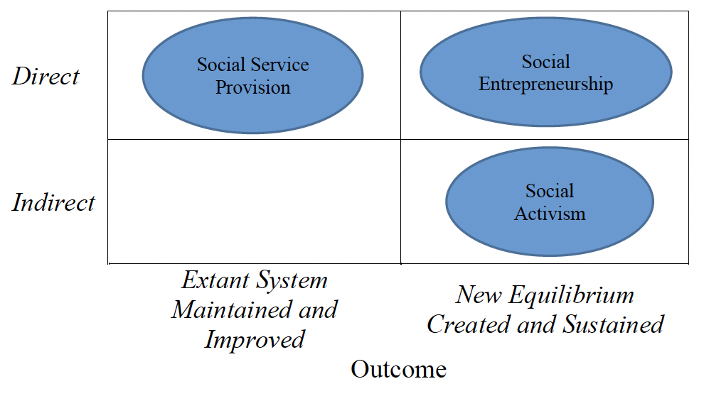 It should be noted that social entrepreneurship is distinguished from social service enterprises and social activism. Social service enterprises have limited results and do not spread, i.e., there is no impact from being replicated and changing the status quo. On the other hand, social activism attempts to create change through indirect actions to influence others to act.