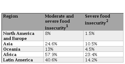 The results are diverse and include the state of people suffering from hunger between 720 to 811 million people, with Asia being the continent with the largest population of 424 million people, followed by Africa with 278 million people, in third place is Latin America with 56.5 million people, continuing with Oceania with 2.5 million people. The percentage of the population with severe food insecurity is found in Africa at 23.4%, Latin America at 14.2%, Asia at 10.5%, Oceania at 4.5%, and North America and Europe at 1.5%.