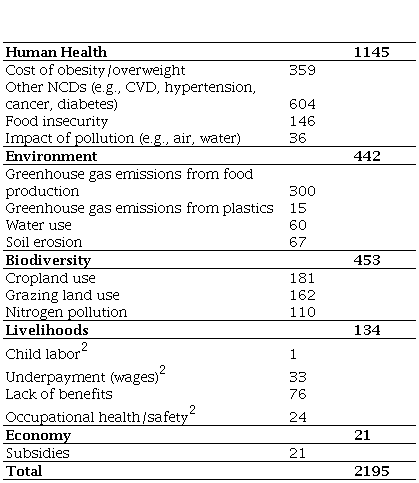 In 2021, it was estimated that current externalities are approximately twice (USD 19.8 trillion) the current total world food consumption (USD 9 trillion). These externalities comprise $7 trillion in environmental costs, $11 trillion in costs to human life, and $1 trillion in economic costs. Therefore, it indicates that food is about one-third cheaper than it would be if these externalities were included in market prices (Global Alliance for the Future of Food, 2021;United Nations Food Systems Summit [UNFSS], 2021).