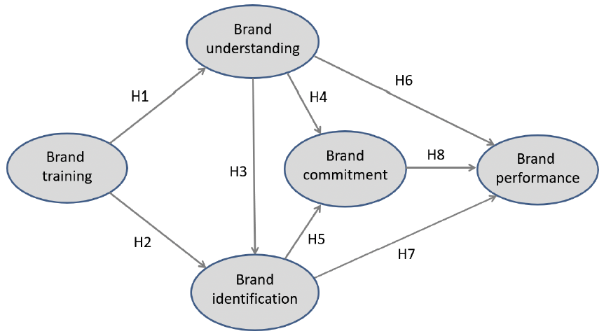Multiple studies have found substantial and significant impacts of brand understanding on brand performance (Murillo & King, 2019; Murillo & Terán-Bustamante, 2020; Piehler, 2018; Xiong et al., 2013; Zhang & Xu, 2021). Brand identification has also shown significant direct effects on performance (Helm et al., 2016; Punjaisri & Wilson, 2011; Taku et al., 2022), although the relationship failed to reach significance in other studies (Piehler et al., 2016). Lastly, the positive relationship between brand commitment and brand performance has been confirmed on numerous occasions from the earliest internal branding studies (Xiong et al., 2013; Du Preez et al., 2017; King, 2010; Piehler et al., 2016; Qureshi et al., 2022; Zhang & Xu, 2021). Based on previous research, the following hypotheses are proposed.
