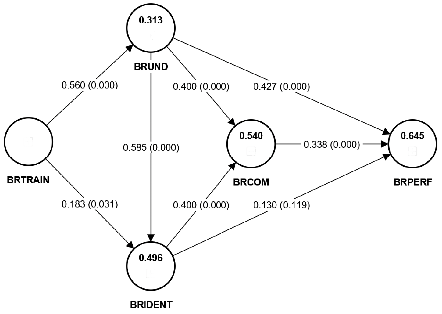 All PLS-estimated AVE values, including those of brand training and commitment, exceed the recommended 0.50 threshold, indicating acceptable convergent validity (Hair et al., 2022). Furthermore, in compliance with the Fornell-Larcker criterion, each of the elements on the main diagonal in Table 4 is larger than the respective row and column off-diagonal elements, which indicates adequate discriminant validity. In addition, the recently recommended HTMT criterion was also examined, and all values fell below the 0.90 threshold, confirming construct discriminant validity (Henseler et al., 2015). Therefore, with acceptable levels for the quality criteria of the PLS measurement model, the analysis can turn to the inner or structural model results (Hair et al., 2022), which are displayed in Figure 2.