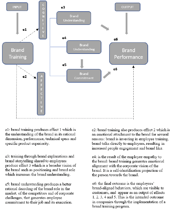 Given the exploratory nature of the research, the study centered on assessing the effectiveness of brand training, the core practice in the internal branding toolkit. Results show a strong and positive impact of training on brand-aligned behavior through the mediation of two cognitive constructs—brand understanding and identification—and one affect-laden construct, brand commitment. This model explained a substantial proportion of the variance in brand performance. However, including additional theoretically grounded predictors in the model may improve results.