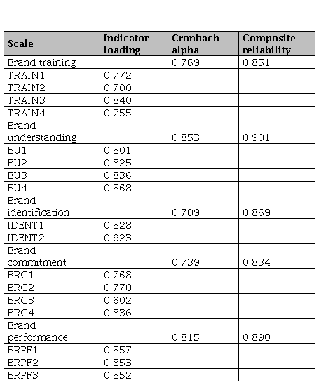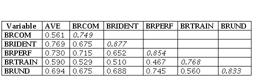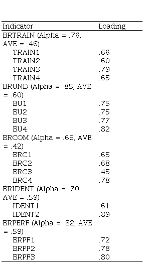 Since the hypothesized model will be estimated with the partial least squares (PLS) technique, which is designed to maximize the explained variance of the latent variables, a judgment on the convergent validity of brand training and brand commitment will be deferred until PLS results are available, while nevertheless making a note of the two low AVE's.