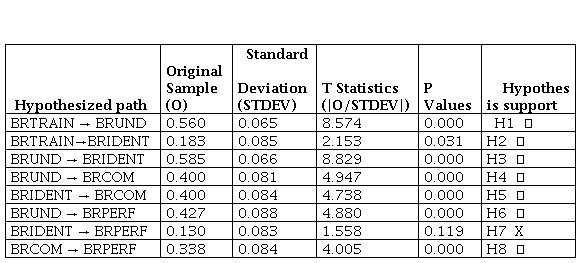 The results show that all estimated path coefficients except the path from brand identification to brand performance are significant. Therefore, hypothesis 7 is not supported. Notwithstanding this, model results reveal a significant impact of brand identification on performance through the mediation of brand commitment. All other hypotheses in the study are supported.